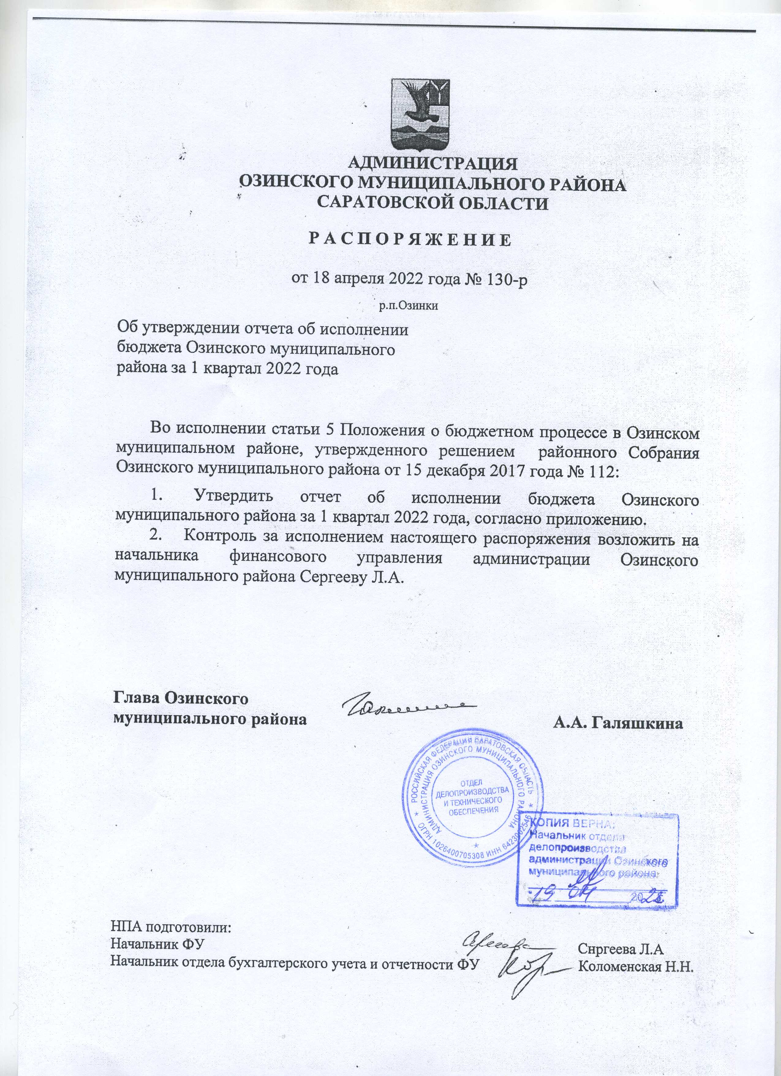 РАСПОРЯЖЕНИЕ от 18 апреля 2022 года №130-р "Об утверждении отчёта об исполнении бюджета Озинского муниципального района за 1 квартал 2022 года"