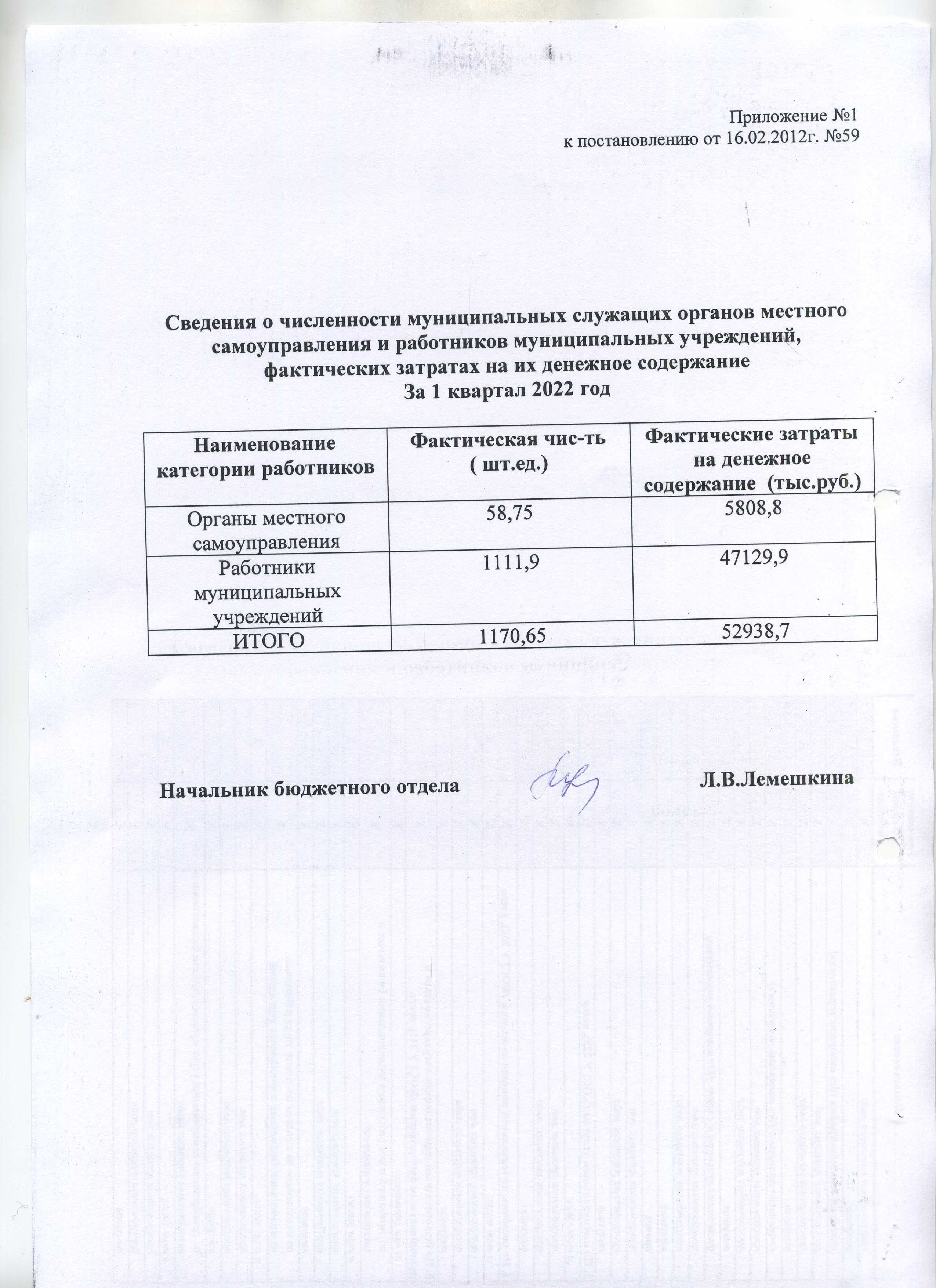 Сведения о численности муниципальных служащих органов местного самоуправления и работников муниципальных учреждений, фактических затратах на их денежное содержание за 1 квартал 2022 года