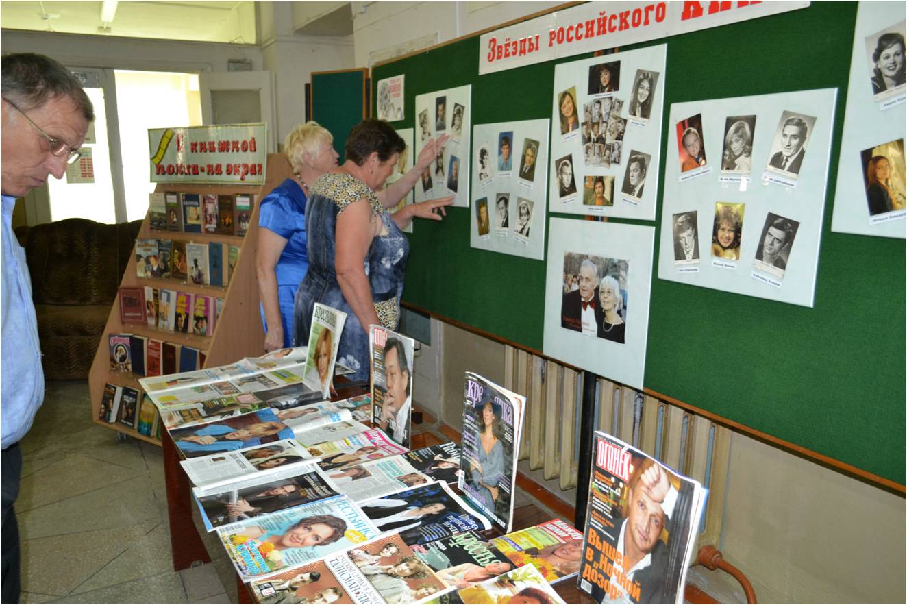 Библиосумерки «Читаем кино», посвященные Году Российского кино, стало участие в акции «Кинолото». Гости с большим интересом находили фото кадр, из предложенных кинофильмов угадывая правильное название фильма. Библиосумерки начались с интересных презентаций книжно- иллюстративных выставок «Волшебный мир кино» и «С книжной полки на экран», ведь литература и кино неразрывно связаны между собой. Привлекала внимание ретро фотопанорама «Звезды российского кино», где присутствующие с удовольствием узнавали своих любимых актеров.
