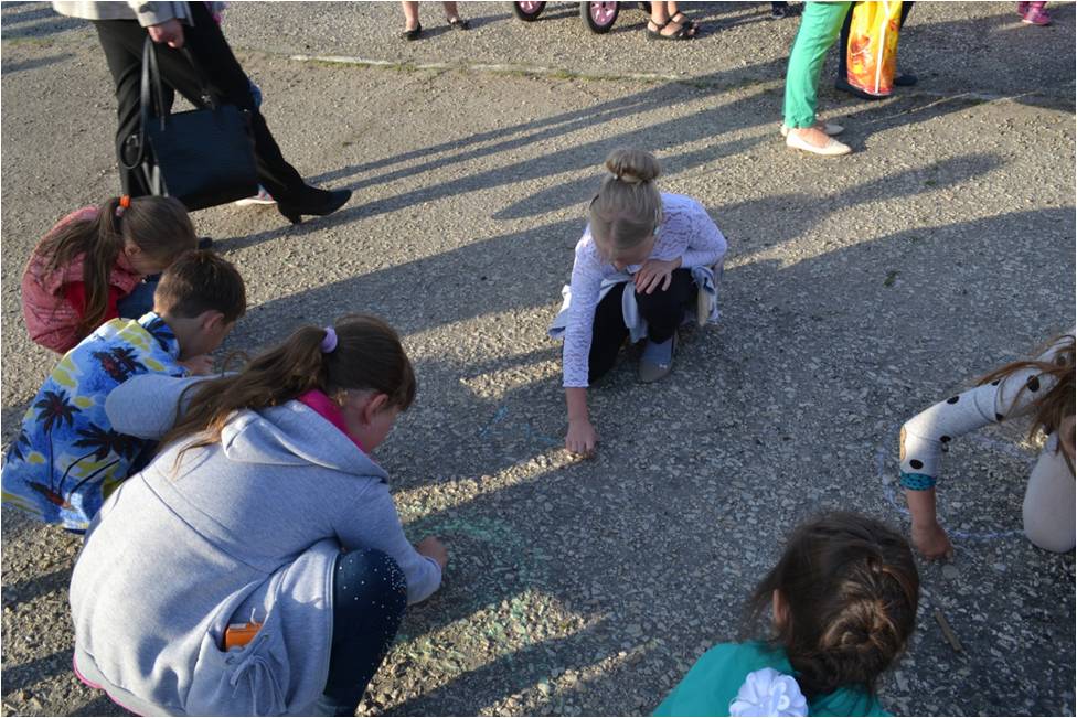 По площади прогуливались сказочные и мультяшные персонажи, веселые артисты играли с ребятами, водили хороводы, рисовали цветными мелками на асфальте.