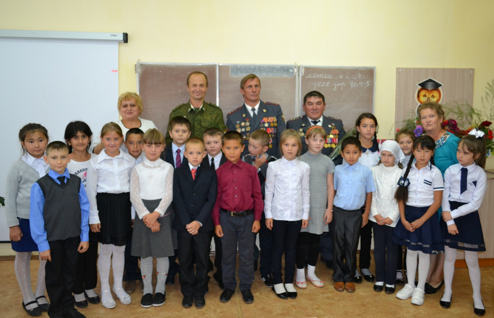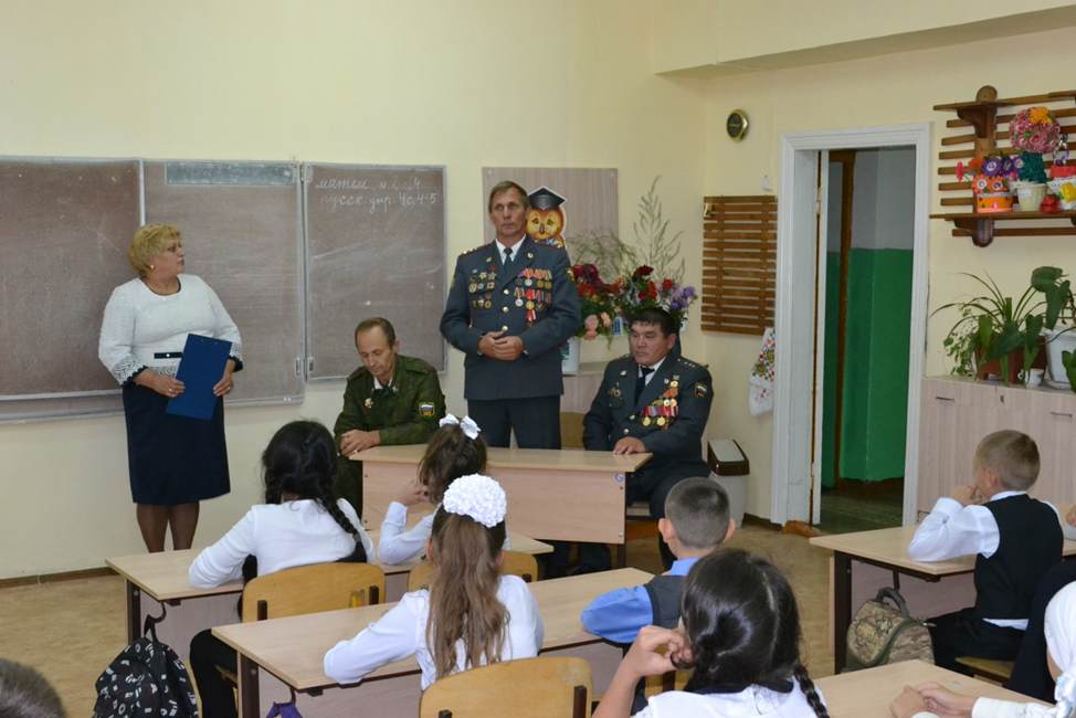 На встрече присутствовали: участник боевых действий в Афганистане и на Северном Кавказе председатель Всероссийской общественной организации «Боевое братство» Чеченев А.В., участник боевых действий на Кавказе Куспеков С.К. и атаман станичного казачьего общества Давыдов Н.Н. Урок проходил в форме диалога.