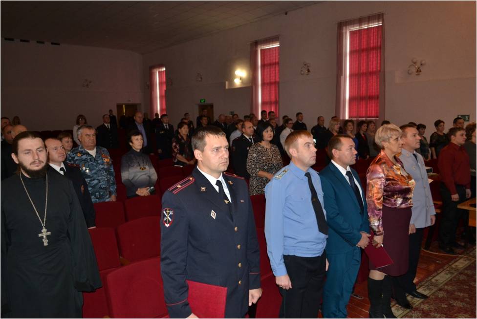 В зале собрались сотрудники полиции, их коллеги по обеспечению правопорядка, охраны мира и спокойствия граждан, ветераны правоохранительных органов и гости.
