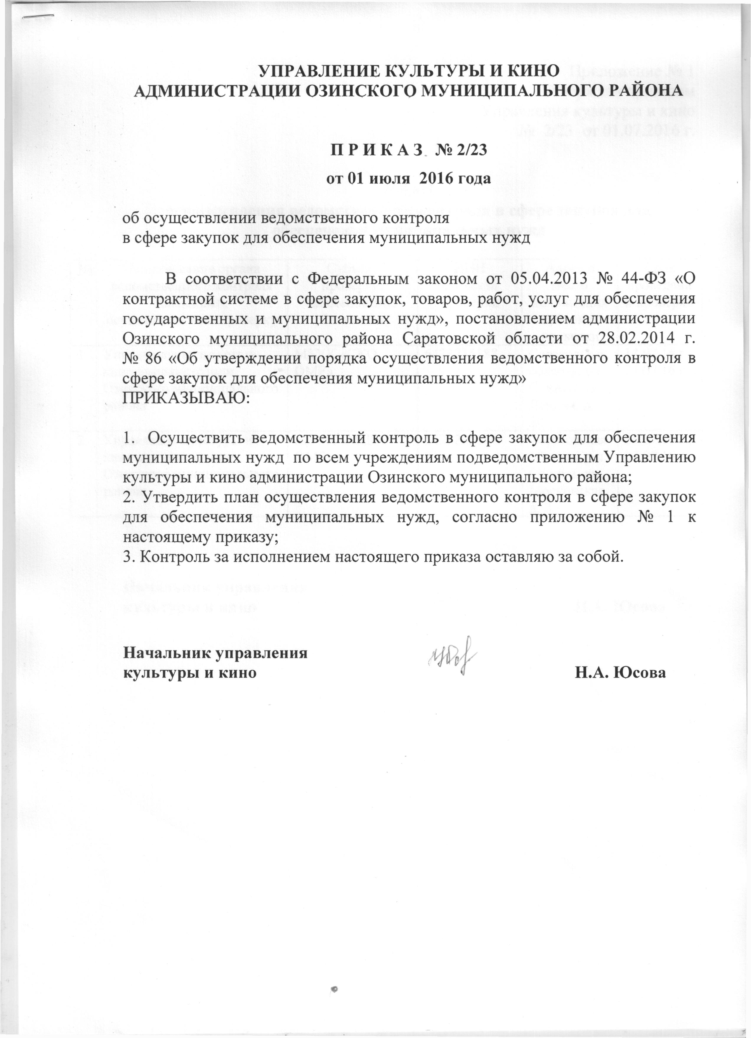 Приказ № 2/23 "Об осуществлении ведомственного контроля в сфере закупок для обеспечения муниципальных нужд"