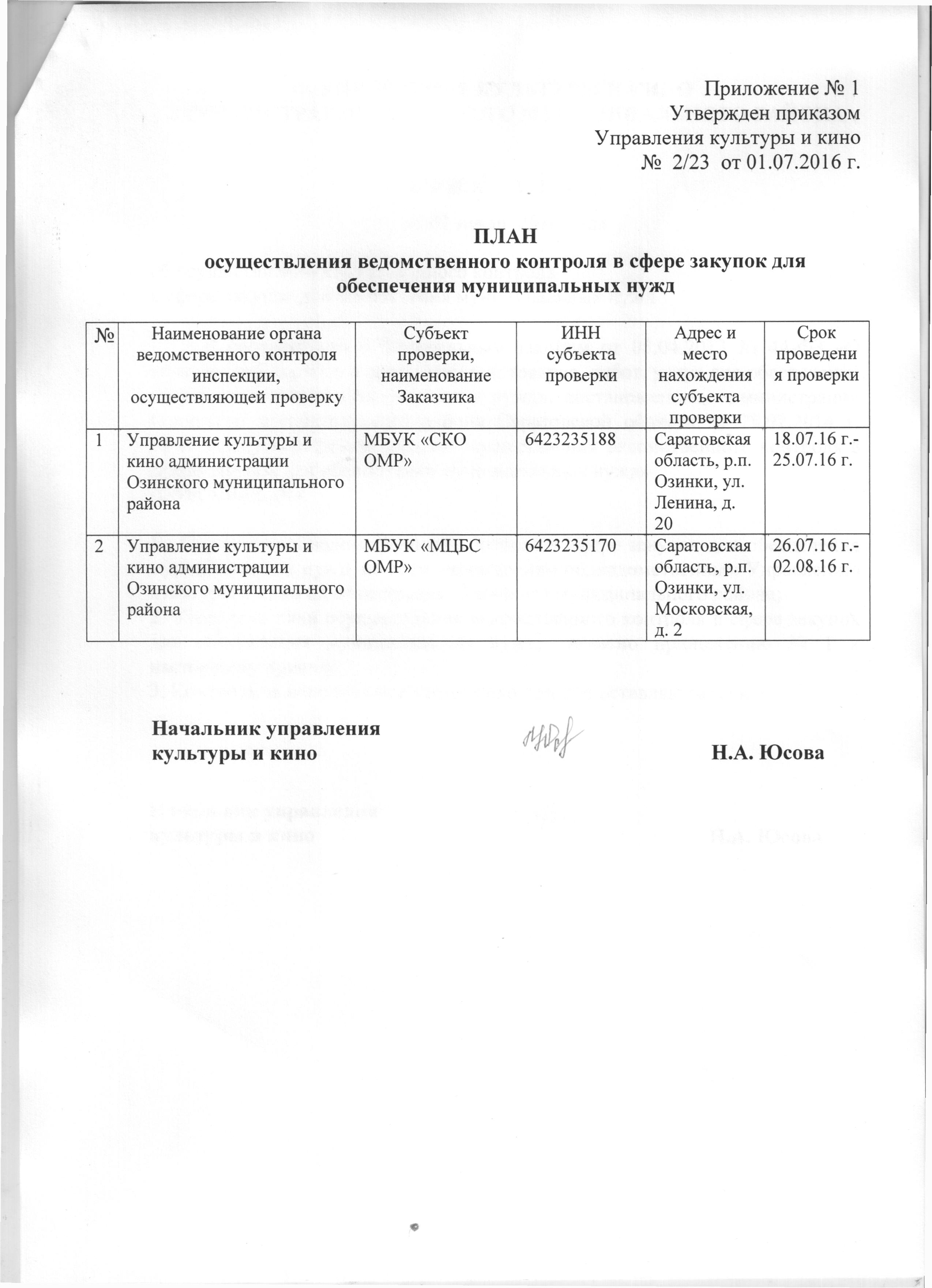 1.1. Плановая проверка проводилась в соответствии с планом осуществления ведомственного контроля в сфере закупок для обеспечения муниципальных нужд, утвержденный приказом Управления культуры и кино администрации Озинского муниципального района от 14.04.2015 года № 2/10 «О создании инспекции»...